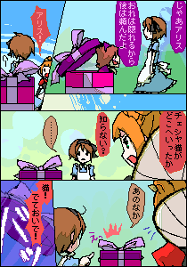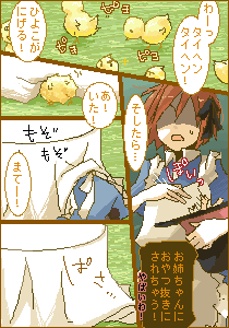 お姉さんの大事なひよこをにがしてしまった! アリスはひよこを追いかけてテーブルの下へと追いかけます。 無事に捕まえられるのでしょうか? *** これより、スタッフによる連続投下をさせて頂きます しばらくの間、板占領失礼します 笹宮愛花(3A)@眠子 |