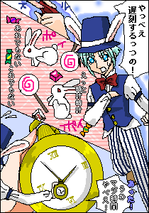 するとどこからともなく 遅刻しては大変と アリスの目の前を大慌てで 正装をした白いウサギが駆けて行きました。 うさぎの分身やお菓子やらをふところから まき散らしながら懐中時計を取り出しながら ウサギは穴の中へ飛び込んで行きました。 水霧響夜(2A)@双葉 |