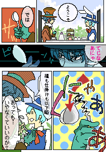 ところがどうやら兎さん、間違った場所に 迷い込んでしまったようです。 イカレ帽子屋さんに引き止められて、 無理やり午後のお茶会に参加させられるはめに。 1回休み。 川原誠(2C)@ふぐ |