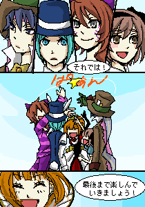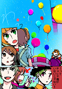 さあ大変!絶体絶命…とおもいきや、 チェシャ猫が入ったはずの箱からはたくさんの風船が! そして猫は客席から現れるのでした 客席より祈里くん、楠馬くんお借りしました 天上甘味(3A)@祐 |